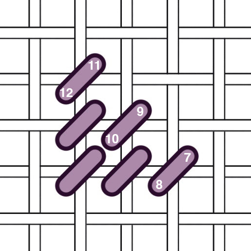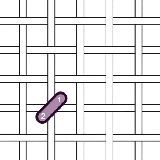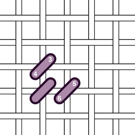 Work down in a diagonal line on the intersections of the canvas, and work up a diagonal line.